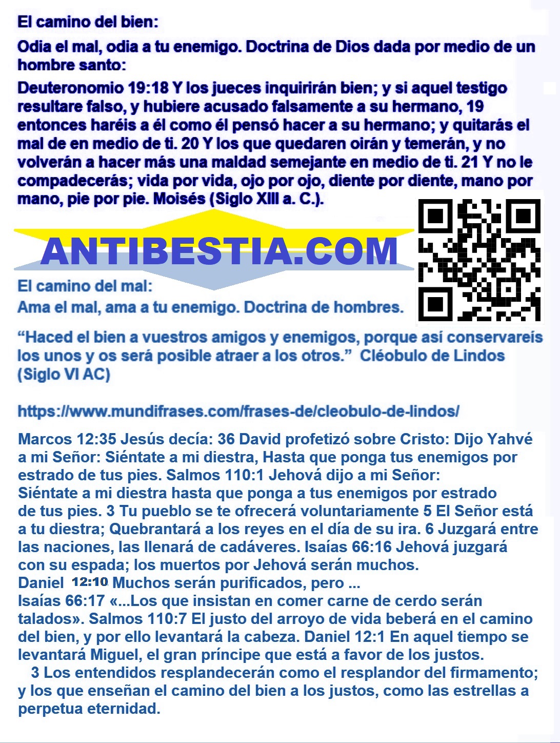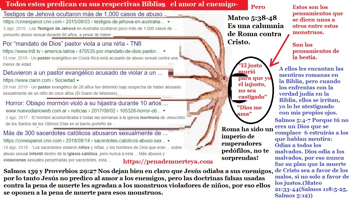 No creas que porque desmiento la doctrina del “amor a los enemigos” y muchas otras doctrinas en el Nuevo Testamento de la Biblia, signifique que yo defienda todos los textos del Antiguo Testamento de la Biblia: Hay serias contradicciones en el Antiguo Testamento: Ezequiel 18:23-24 dice que Dios no desea destruir al malvado y que es posible que el malvado se convierta en justo y que el justo se convierta en malvado, pero en base a los mensajes Daniel 12:10, Salmos 118:18-20 y en mi propia experiencia (Salmos 41:4-10), he llegado a la conclusión de que una persona que es injusta jamás puede dejar de pecar, pero que una persona que es justa puede trasgredir la ley de Dios solo si no la conoce, en mi caso cuando yo era católico yo me arrodillaba delante de las cruces y las demás imágenes católicas de esa iglesia para rezar (el pecado de la idolatría (Transgresión contra Éxodo 20:5)), y cuando dejé de ser católico pero yo aún no descubría cierta falsedad de Roma en la Biblia, yo comía carne de cerdo porque estaba confiado en la veracidad de un mensaje en 1 Timoteo 4 (El pecado de cometer actos impuros (Transgresión contra Deuteronomio 14:3)). El mensaje en Daniel 12:3-10 contradice el mensaje en Ezequiel 18:23-24, el mensaje en Proverbios 9:8-10 y en Apocalipsis 22:11 defiende el mensaje en Daniel 12:3-10. En el antiguo testamento otra de las cosas que no cuajan con la justicia es considerar justo a Jacob, como si la victoria de los justos fuese la victoria de Jacob (Salmos 14:5-7), Jacob engañó a su padre que estaba ciego para usurpar a su hermano Esaú y lograr de ese modo, que bajo la ignorancia, su padre Isaac lo bendiga a él y no a Esaú, eso no hacen las personas justas (Génesis 27:5-40), pero verán en la narración como la madre de Esaú y de Jacob maquinó esta injusticia, por eso mismo el mandamiento “Honrarás padre y madre” (Éxodo 20:12), debe tener cláusulas de excepción que no he encontrado en el Antiguo Testamento, pero eso no significa que nunca hayan existido, justificar al malvado o condenar al justo son actos que Dios aborrece (Proverbios 17:15). Por si esto no fuese suficiente, Eclesiastés es un libro que lo he hallado falso, no inspirado en la justicia: Eclesiastés 7:16-18 dice que no hay que ser sabio en exceso y no hay que ser ni muy justo ni muy injusto, mientras que Proverbios 1:7 y Proverbios 9:9 muestra a la sabiduría como algo deseable y que es bueno ser cada vez más sabio, sin un límite que te diga: “Hasta aquí no más, ya eres demasiado sabio”; y además Proverbios 29:27 enseña que no hay tamices o grises: O eres blanco o negro (Espiritualmente hablando: O eres justo o eres injusto): Observa además como Eclesiastés 7:16-18 invita a probar de todo afirmando que con solo temer a Dios, saldrás librado del mal, como si temer a Dios significase transgredir a propósito su ley, (Ese mensaje es semejante a los mensajes en el Nuevo Testamento que te incitan a comer carne de cerdo sin que te sientas por ello pecador, pero con esa falsedad romana atribuida por ellos a los santos, los romanos insultan la sangre de personas fieles a Dios quienes murieron asesinadas a manos de los perseguidores griegos, por negarse a comer carne de cerdo (2 Macabeos 6:18-20), los romanos, inspirados en Zeus o Júpiter y en su dios sol invencible, han contradicho los claros mensaje de Isaías y de Moisés (Mateo 15:17, 1 Timoteo 4, Deuteronomio 14:3, Isaías 65:4, Isaías 66:17). Si lees el evangelio de Tomás veras un mensaje que defiende las falsedades en Mateo 15:17 y 1 Timoteo 4 tocante a los alimentos prohibidos, si lees el Evangelio de Felipe verás un mensaje que defiende la mentira romana del nacimiento de Jesús a partir de una mujer que, pese a estar embarazada era virgen, para esa falsedad los romanos sacaron de contexto la profecía en Isaías 7, si lees el libro de Enoc encontrarás narraciones absurdas sobre las leyes de la naturaleza, y otras cosas que no cuadran. Por estas razones y más me lavo las manos tanto del contenido de la Biblia como de los Apócrifos, ambos en su conjunto son falsos, durante mi ignorancia defendí estos textos y por eso me corrijo así de esos errores involuntarios, que mi sitio web de 2004 evidencia que lo cometí. Esta página: https://www.geocities.ws/naodanxxii/idolos.html ⚠️ El sitio en geocities[.]ws/naodanxxii ya no es seguro y no es mío, no lo visites, contiene una copia preparada por terceros, de la página web que creé en Geocities, un antiguo servicio de hosting que tenía Yahoo en 2004, Geocities de Yahoo ya no existe, y perdí el acceso a mi antigua dirección de correo electrónico de Yahoo asociada a esa página web, mi página había dejado de existir, sin embargo hace aproximadamente un año, para mi sorpresa encontré una copia exacta de esa página web. , con una dirección URL similar a la original, no puedo borrar ni editar esa copia, pero si lees allí encontrarás evidencia de que mi interés por la religión no está motivado por el interés de amasar dinero mediante engaños, ni por tener un harén de mujeres a mi disposición, ni por recibir los aplausos de la multitud, mi interés se basa en que creo que Dios existe y por eso busco a Dios para que me dé su bendición, plasmada en una mujer leal y virgen para unirme a ella en matrimonio, no yendo a Él con mentiras como lo hizo Jacob contra su padre, sino yendo a mi Padre con la verdad, a pesar de mis errores involuntarios, mi objetivo era el mismo: “Mi interés en el tema de la religión comenzó desde mi interés anterior y actual en tener una mujer justa.”: Proverbios 28:13 El que encubre sus pecados no prosperará; Pero el que confiesa sus pecados y se aparta de ellos alcanzará el favor de Jehová. Proverbios 18:22 El que encuentra esposa halla el bien, y alcanza favor de Jehová. Levítico 21:14 No tomará mujer viuda, ni mujer divorciada, ni mujer prostituta, ni mujer infame, sino que él tomará por esposa a una m