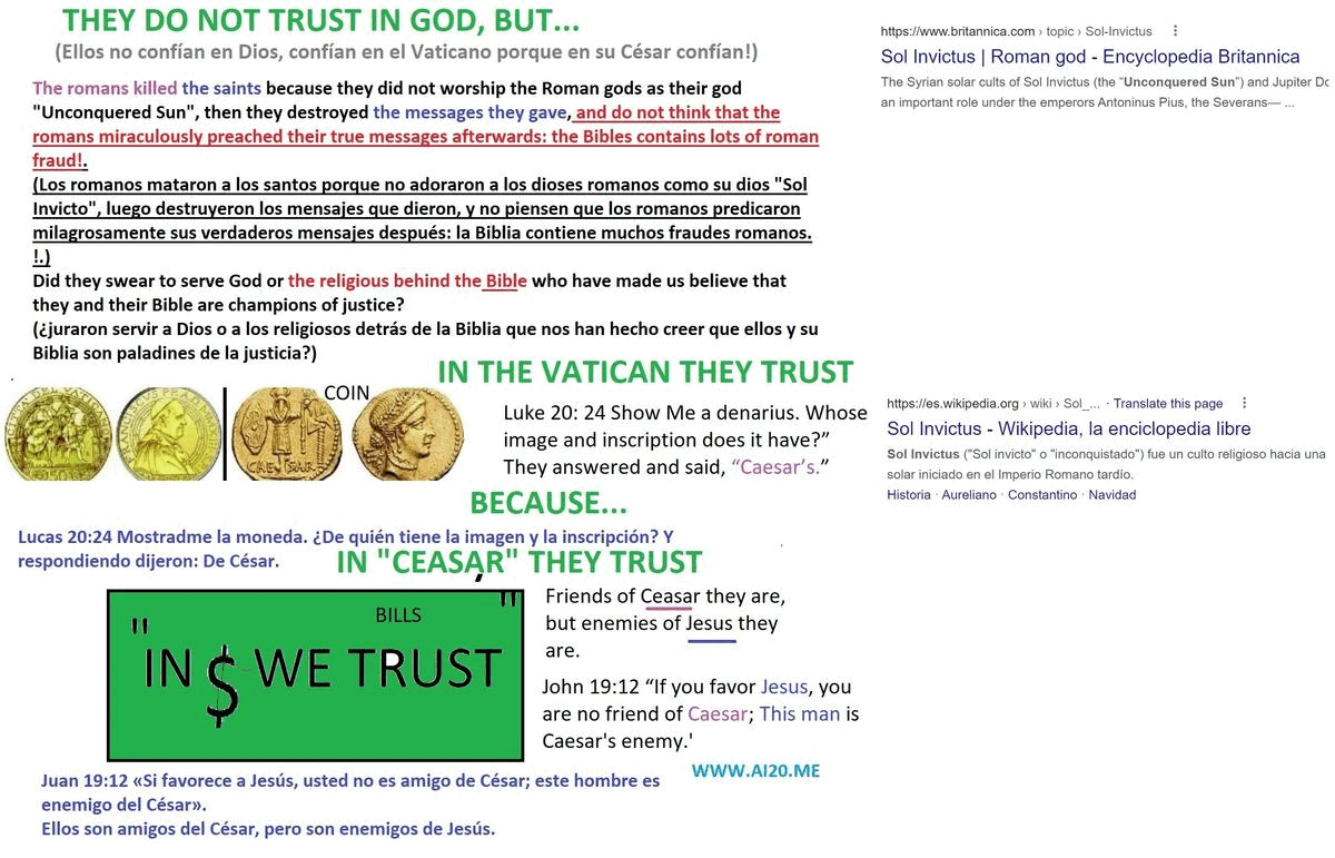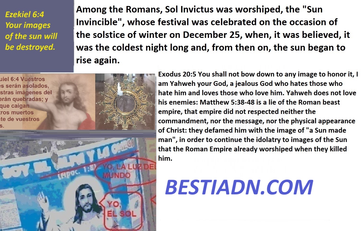 Riddle, what are we talking about?: From the moment you are born they are already accusing you saying: «He was born with original sin and he needs to be baptized.» When your parents take you to their church there they teach you to beat your chest saying this: «I confess that I have sinned and I also confess that it is my fault, my great fault.» If you have enemies who attack you, they tell you: «If you want to be forgiven for your sins, forgive your enemies, remember that we are all sinners.«. If you transgress the doctrines of that church, they call you a sinner and tell you that you transgress God’s rules, I understand that God is an uncreated being and is superior; If justice is a higher value, would God be in favor of condemning the innocent along with the guilty?, That church is the remnant of an empire that persecuted a group of people who respected justice, the Roman empire was a empire that destroyed the scriptures of the faith that it persecuted, however they tell you that that empire converted to the faith that it persecuted and that it began to preach the messages that it persecuted, and they also tell you that in the Bible that they have accepted there are the messages that they persecuted but that they later dedicated themselves to defending, I ask you, do you believe them?, Do they seem trustworthy to you?, If you are righteous, why should you join a group of people whose conscience does accuse them of being unrighteous?, If you are righteous, the best thing you can do is not to carry in your shoulders the blame of others, it is not in your best interest to carry the burden of those unjust who do injustice but who believe that they will be forgiven for following rules handed down from other unjust people and for spreading their lies. Answer: We are talking about the religion of the Devil, the one whom the Romans of the past have worshiped: Man, Zeus, the sun (Triumvirate of the Romans). Among the Romans, Sol Invictus was worshiped, the «Sun Invincible», whose festival was celebrated on the occasion of the solstice of winter on December 25, when, it was believed, it was the coldest night long and, from then on, the sun began to rise again. Exodus 20:5 You shall not bow down to any image to honor it, I am Yahweh your God, a jealous God who hates those who hate him and loves those who love him. Yahweh does not love his enemies: Matthew 5:38-48 is a lie of the Roman beast empire, that empire did not respected neither the commandment, nor the message, nor the physical appearance of Christ: they defamed him with the image of «a Sun made man», in order to continue the idolatry to images of the Sun that the Roman Empire already worshiped when they killed him.