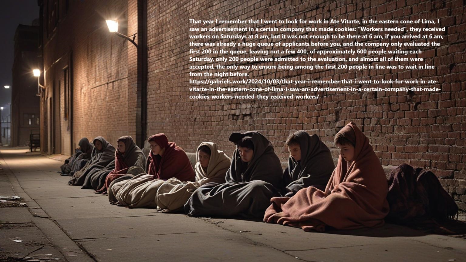 Así que luego de no alcanzar vacante en el primer intento, pues yo no sabía lo que estoy diciendo, en el segundo intento fui con mi frazada el Viernes en la noche, mientras muchos de 29 años de edad los Viernes se la pasaban en discotecas, yo estaba allí y no disfrutando de mi juventud, a causa de la pobreza de la que supuestamente el tío mediocre me quiso salvar, y por todo el hostigamiento familiar sufrido porque a ellos no les gustó que yo reniegue del catolicismo. Así que en la vereda, junto con otros pobres, allí estaba yo, durmiendo sentado en la vereda, pero durmiendo con un ojo abierto, no sea que alguien me robe el dinero de mi pasaje, éramos varias decenas de personas esperando allí una oportunidad para trabajar honradamente, yo estaba viendo las cucarachas pasar por la vereda cerca a nosotros, mientras estaba conversando con la gente de la cola sobre experiencias terribles de explotación en empleos en otros lugares, y de lo difícil que era encontrar un empleo, y así fue la madrugada del Sábado. En la mañana del Sábado,a las 8 am, entramos los 200 primeros de la cola, yo estaba más o menos en el puesto 60, así que fui aceptado, pero solo trabajé tres semanas, me ví obligado a renunciar, y aquí contaré el por qué: