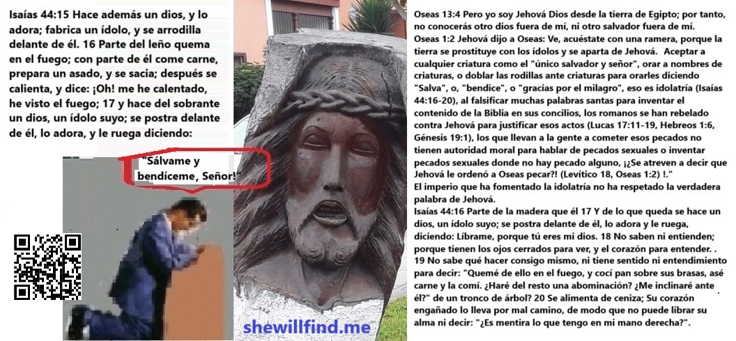 Oseas 1:2 Jehová dijo a Oseas: Ve, acuéstate con una ramera, porque la tierra se prostituye con los ídolos y se aparta de Jehová. Aceptar a cualquier criatura como el «único salvador y señor», orar a nombres de criaturas, o doblar las rodillas ante criaturas para orarles diciendo «Salva», o, «bendice», o «gracias por el milagro», eso es idolatría (Isaías 44:16-20), al falsificar muchas palabras santas para inventar el contenido de la Biblia en sus concilios, los romanos se han rebelado contra Jehová para justificar esos actos (Lucas 17:11-19, Hebreos 1:6, Génesis 19:1), los que llevan a la gente a cometer esos pecados no tienen autoridad moral para hablar de pecados sexuales o inventar pecados sexuales donde no hay pecado alguno, ¡¿Se atreven a decir que Jehová le ordenó a Oseas pecar?! (Levítico 18, Oseas 1:2) !.»