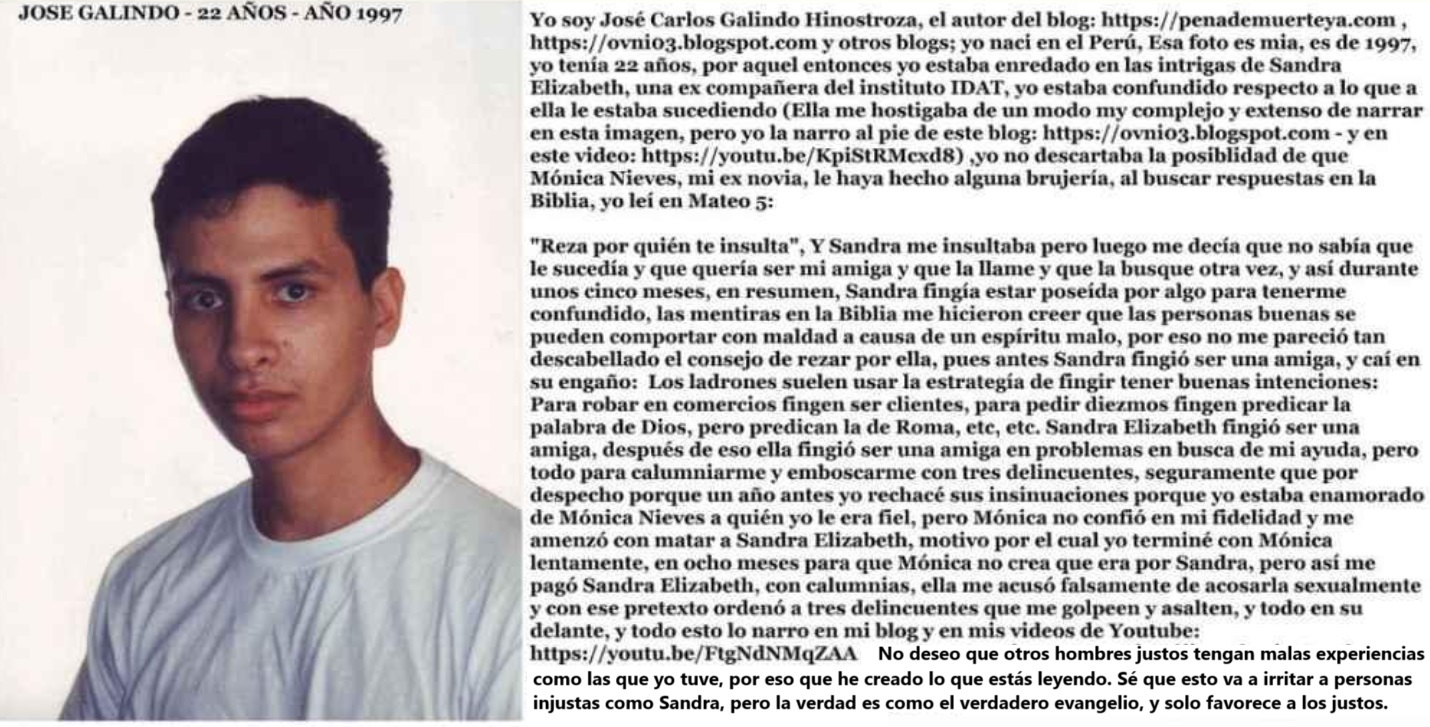 Nací en Perú, esa foto es mía, es de 1997, tenía 22 años, en ese tiempo estaba enredado en las intrigas de Sandra Elizabeth, una excompañera del instituto IDAT, estaba confundido sobre lo que le pasaba (Ella me acosó de una manera muy compleja y extensa para narrar en esta imagen, pero lo narro en la parte inferior de este blog: ovni03.blogspot.com y en este video: https://youtu.be/KpiStRMcxd8). No descarté la posibilidad de que Mónica Nieves, mi exnovia, le hubiera hecho alguna brujería.