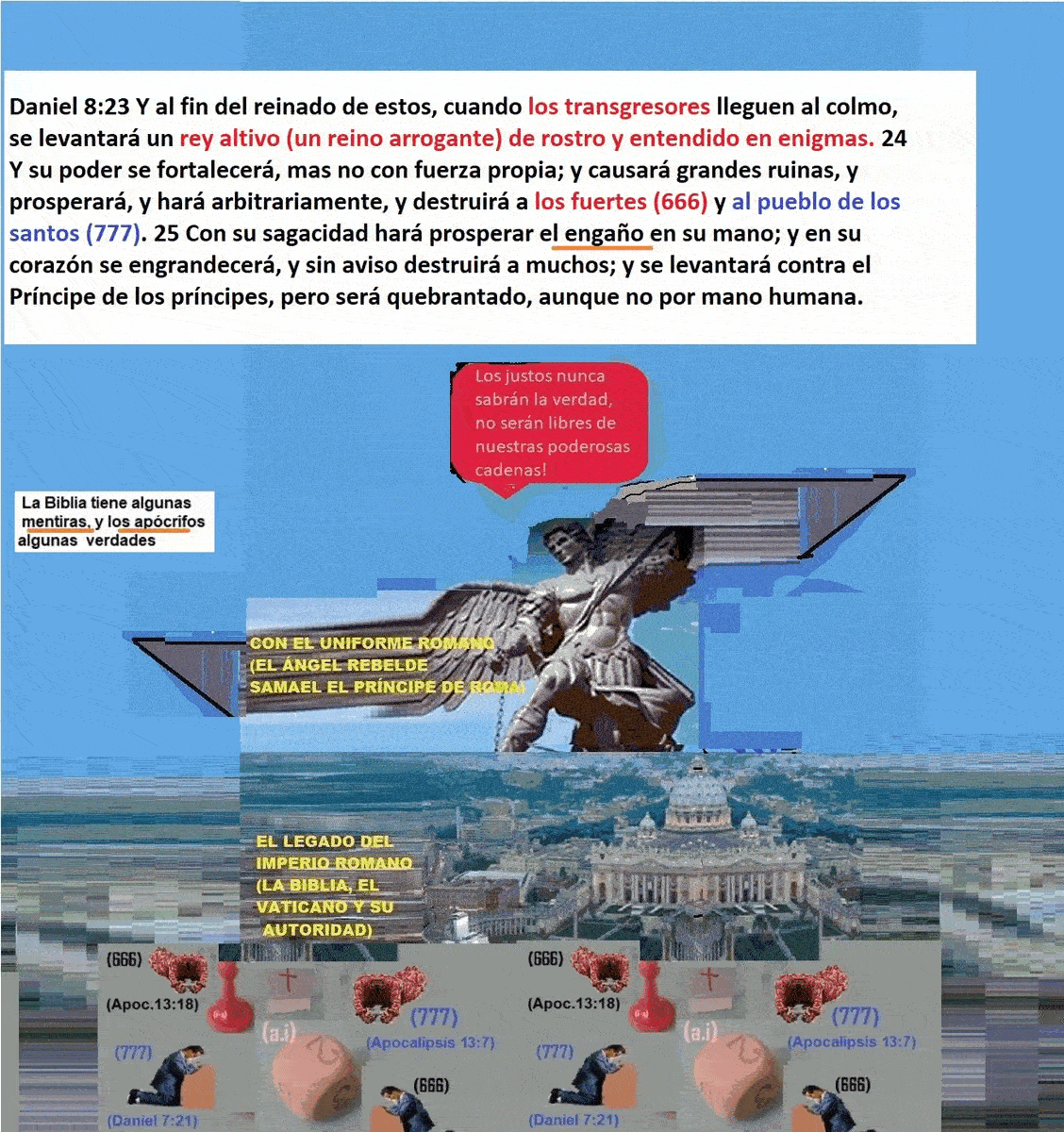 Con estás palabras: Gálatas 1:6-8 Mas si aun nosotros, o un ángel del cielo, os anunciare otro evangelio diferente del que os hemos anunciado, sea anatema. San Pablo se refería a sus perseguidores romanos que después lo asesinarían decapitándolo para destruir el evangelio que el predicaba y anunciar uno diferente, uno reflejado en la Biblia de los romanos, a la cual se convirtieron para no cambiar en lo absoluto su conducta invasora. Los sucesores de esos malvados invasores predican estupideces del imperio romano transformado en el imperio de la falsa religión: