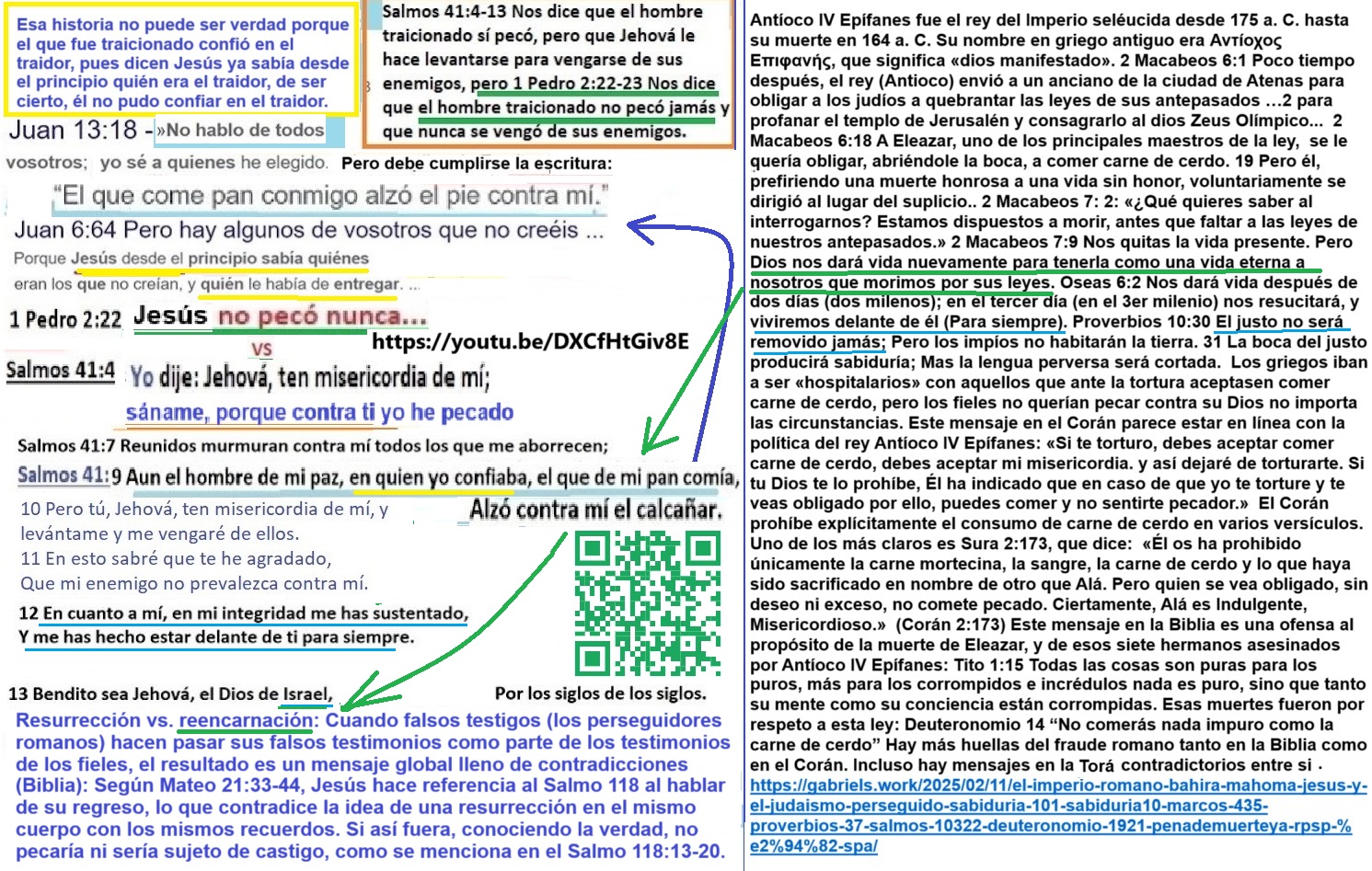 No por el hecho de citar estos pasajes de la Biblia quiere decir que defienda su contenido como un todo. No lo hago porque no puedo aceptar que, por un lado, Dios haya protegido de la pena de muerte a Caín y, por otro, haya condenado a muerte a quienes cometen crímenes como los que él cometió. En ese sentido, Génesis 4:15 parece la palabra de Satanás, mientras que Números 35:33 sí parece la palabra de Dios. Si pasó por el filtro del Imperio Romano, no podemos esperar que no haya manipulaciones en lo que ellos llamaron “textos sagrados”. Una vez aclarado esto, prosigo: Daniel 12:1-3 habla de que los justos volverán a la vida, pero que ellos sufrirán angustia, como la angustia de una guerra, de una guerra en “el cielo”, una guerra en contra de los justos en la segunda vida de los justos. Observa lo que el ángel de Dios Eterno le dice al profeta Daniel: Daniel 12:1-2 «En aquel tiempo se levantará Miguel, el gran príncipe que está de parte de los hijos de tu pueblo; y habrá angustia, cual nunca la hubo desde que la humanidad existe; pero en aquel tiempo será libertado tu pueblo, todos los que se hallen escritos en el libro. Y muchos de los que duermen en el polvo de la tierra serán despertados, unos para vida eterna, y otros para vergüenza y confusión perpetua.» Únicamente los justos se libran del dolor con el conocimiento de la verdad respecto al camino de la justicia: Proverbios 11:9 dice: «Con la boca el impío destruye a su prójimo, pero los justos se libran por el conocimiento.» ¿Quiénes son los que se hallan escritos en el libro? Ellos son los justos, porque en el siguiente verso se resalta la enseñanza del camino de la justicia, y los únicos que pueden enseñar el camino de la justicia son los justos: Daniel 12:3 «Los entendidos resplandecerán como el resplandor del firmamento; y los que enseñan el camino de la justicia a la multitud de justos brillarán como las estrellas a perpetua eternidad.» ¿Son todos potencialmente “personas justas”? No. Este mensaje es explícito y niega la posibilidad de que una persona que “no esté inscrita en el libro” pueda convertirse en alguien que sí lo esté. Recuerda que una oveja descarriada no es lo mismo que un lobo. Un lobo nunca se convertirá en oveja, un lobo nace lobo. El buen pastor busca a la oveja descarriada para encarrilarla, pero el buen pastor caza a los lobos. No hay amor por los lobos y por las ovejas al mismo tiempo; no hay amor universal, no hay tal cosa como “ama a tus enemigos”. Daniel 12:10 «Muchos serán limpios, emblanquecidos y purificados; los impíos procederán impíamente, y ninguno de los impíos entenderá, pero los entendidos comprenderán.» Este mensaje es importante resaltarlo porque, precisamente, los malvados perseguidores romanos y sus malvados sucesores nunca se convirtieron a la verdadera fe que ellos persiguieron. Precisamente porque “los impíos procedieron impíamente”, ninguno de ellos se convirtió en justo al leer el mensaje de la justicia. Todo lo contrario: estos impíos adulteraron y tergiversaron el sentido y el contenido de muchas leyes y muchas profecías pertenecientes a la religión que persiguieron, creando así una nueva religión de la cual dijeron que era la perseguida, y a la que posteriormente se convirtieron. Entonces, así como sucedió con los perseguidores romanos respecto a los justos, así sucede con los perseguidores del tiempo del fin respecto a los justos. Pero como esta ya es la “segunda vida” de los justos, y porque en esa segunda vida ya están “en el cielo”, el final es muy diferente para los justos (Salmos 91, Salmos 118, Salmos 41). En la primera vida, los justos ya murieron por amor al eterno Dios, y no tienen por qué morir otra vez en su segunda vida. Esa segunda vida, por lo tanto, es eterna: 2 Macabeos 7 «Tú, criminal, nos quitas la vida presente. Pero el Rey del mundo nos resucitará a una vida eterna a nosotros, que morimos por sus leyes.» Apocalipsis 12:7-10 «Después hubo una gran batalla en el cielo: Miguel y sus ángeles luchaban contra el dragón; y luchaban el dragón y sus ángeles, pero no prevalecieron, ni se halló ya lugar para ellos en el cielo. Y fue lanzado fuera el gran dragón, la serpiente antigua, que se llama diablo y Satanás, el cual engaña al mundo entero; fue arrojado a la tierra, y sus ángeles fueron arrojados con él. Entonces oí una gran voz en el cielo, que decía: Ahora ha venido la salvación, el poder y el reino de nuestro Dios, y la autoridad de su Cristo; porque ha sido lanzado fuera el acusador de nuestros hermanos, el que los acusaba delante de nuestro Dios día y noche.» Mira cómo se alegran los que sirven a Dios. Ellos comen y beben. ¿Acaso “los espíritus” en un “mundo abstracto” pueden comer y beber? Los hipócritas dicen que la vida eterna no implica la inmortalidad en un cuerpo físico de carne y hueso, sino que es la “inmortalidad del alma”. Isaías 65:13-16 «Por tanto, así dijo Jehová el Señor: He aquí que mis siervos comerán, y vosotros tendréis hambre; he aquí que mis siervos beberán, y vosotros tendréis sed; he aquí que mis siervos se alegrarán, y vosotros seréis avergonzados. He aquí que mis siervos cantarán por júbilo del corazón, y vosotros clamaréis por el dolor del corazón, y por el quebrantamiento de espíritu aullaréis. Y dejaréis vuestro nombre por maldición a mis escogidos, y Jehová el Señor te matará, y a sus siervos llamará por otro nombre. El que se bendijere en la tierra, en el Dios de verdad se bendecirá; y el que jurare en la tierra, por el Dios de verdad jurará; porque las angustias primeras serán olvidadas, y serán cubiertas de mis ojos.» Las angustias en “el cielo” serán cosa del pasado. https://youtu.be/GIU5Iotfv40