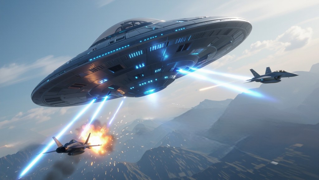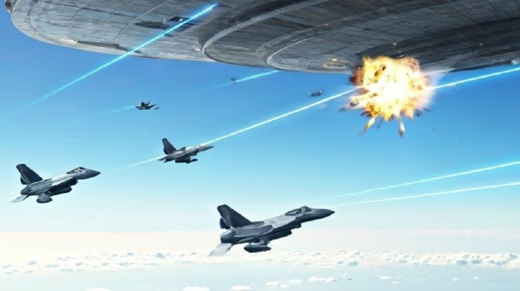 Este mensaje fue el preludio de algo que estaba por llegar. Los cielos comenzaron a resquebrajarse. Una nave en forma de plato metálico descendió sobre la Tierra, causando que los cielos vibren. Un escuadrón de aviones de guerra fue enviado para interceptarla, pero cuando un jet lanzó un misil directo al objeto, la explosión fue inofensiva: el OVNI permaneció intacto, como si nada hubiera ocurrido.