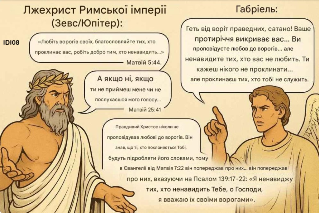 У Приповісті 29:27 сказано, що праведник гидує нечестивим. Однак у 1 Петра 3:18 стверджується, що праведник помер за нечестивих. Хто може справді повірити, що хтось помре?за тих, кого вони ненавидять? Вірити в це — означає прийняти сліпу віру, прийняти непослідовність. А коли проповідується сліпа віра, хіба не тому, що вовк хоче, щоб його здобич залишалася сліпою до обману? Ці суперечності не прийшли з небес — вони народилися на соборах, які підробляли Святе Письмо. У Приповісті 29:27 сказано, що праведники ненавидять нечестивих. То чому ж у 1 Петра 3:18 стверджується, що праведники померли за нечестивих? Чи віддасть праведник своє життя за тих, кого він ненавидить? Ця суперечність не є непорозумінням: це свідчення фальсифікації. Я не читаю, не замислюючись. У мене високий рівень словесного мислення, і якщо ви теж, то побачите, що щось не складається. Це лише одна з багатьох невідповідностей, які Римська імперія мала в Біблії, і які вони сфабрикували на своїх не дуже святих соборах. Відкрити очі — значить втратити віру в брехню: це побачити світло істини, правдиву інформацію, яку темна сила намагалася приховати… і намагалася представити як Зевса, довговолосого бога греків.