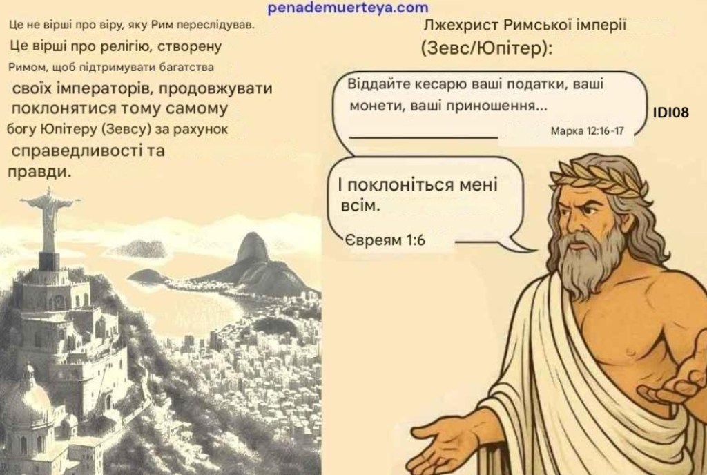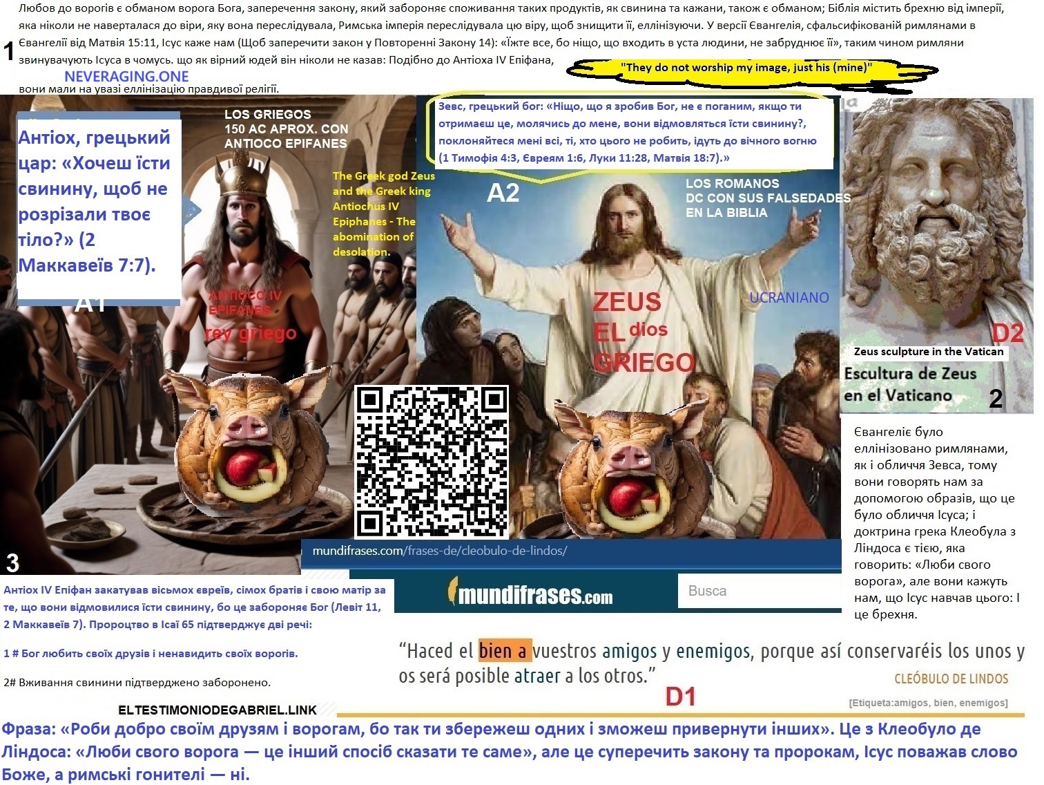 «Римська імперія, Бахіра, Мухаммед, Ісус і переслідуваний іудаїзм. Вступне повідомлення: Подивіться, у що вірили ті, хто відмовлявся їсти свинину, незважаючи на тортури царя Антіоха IV Епіфана, поклонника Зевса. Подивіться, як літній Елеазар разом із сімома братами та їхньою матір’ю був убитий грецьким царем Антіохом за відмову їсти свинину. Чи Бог був настільки жорстокий, щоб скасувати закон, який Він Сам встановив і заради якого ті вірні євреї віддали своє життя в надії отримати вічне життя через цю жертву? Бог не жорстокий, інакше Бог не був би найкращим. Бог не є другом злих, інакше Бог був би жорстоким і був би частиною проблеми, а не вирішення. Ті, хто скасував цей закон, не були ані Ісусом, ані його учнями. Це були римляни, які мали тих самих богів, що й греки: Юпітер (Зевс), Купідон (Ерос), Мінерва (Афіна), Нептун (Посейдон), І римляни, і греки насолоджувалися свининою та морепродуктами, але вірні євреї відкидали ці продукти. 2 Маккавеїв 7:1 Сімох братів і їхню матір було заарештовано. Король хотів змусити їх їсти свинину, що було заборонено законом, биючи батогами та бичачими жилами. 2 Один із них промовив від імені всіх братів, кажучи: «Що ви хочете знати, запитуючи нас? Ми радше померти, ніж порушити закони наших предків». 8 Він відповів рідною мовою: «Не буду їсти свинини!» Тож його теж піддали мукам. 9 Але коли він видихнув, він сказав: Ти, злочинець, забираєш наше нинішнє життя. Але нас, померлих за його законами, Бог воскресить до вічного життя. повідомлення: Народження і смерть четвертого звіра. Греко-римський союз одними богами. Імперія Селевкідів. Стережіться віри в Євангеліє антихриста (Добра новина для неправедних, хоча й фальшива) Якщо ви хочете вберегтися від обману противника справедливості, вважайте, що: Щоб відкинути фальшиве Євангеліє Риму, визнайте, що якщо Ісус був праведним, то Він не любив Своїх ворогів, і якщо Він не був лицеміром, то Він не проповідував любов до ворогів, тому що Він не проповідував те, чого не робив: Приповісті 29: 27 Праведний ненавидить неправедного, а неправедний ненавидить праведного. Це частина Євангелія, підроблена римлянами для Біблії: 1 Петра 3:18 Бо Христос один раз умер за гріхи, Праведний за неправедних, щоб привести нас до Бога. Тепер подивіться на це, що спростовує цей наклеп: Псалом 118: 20 Це брама Господня; туди увійде праведний. 21 Я буду дякувати Тобі, бо Ти почув мене і був моїм спасінням. 22 Камінь, який відкинули будівничі стала наріжним каменем. Ісус проклинає своїх ворогів у притчі, яка передбачає його смерть і повернення: Luke 20:14 Як побачили ж виноградарі, то міркували між собою, кажучи: Це спадкоємець; ходімо, уб’ємо його, щоб спадок був наш. 15 Тож вони вигнали його з виноградника й убили. Що тоді зробить із ними господар виноградника? 16 Він прийде і вигубить цих виноградарів, а виноградник віддасть іншим. Почувши це, вони сказали: «Звичайно ні!» 17 Але Ісус поглянув на них і сказав: «Що ж це написано: Камінь, який відкинули будівничі, став наріжним каменем?» Він говорив про цей камінь, кошмарний камінь царя Вавилона: Даниїла 2:31 Коли ти дивився, о царю, ось великий бовван стоїть перед тобою, надзвичайно великий бовван, а слава його була надзвичайно велика; його вигляд був жахливим. 32 Голова боввана була з чистого золота, груди й руки — зі срібла, живіт і стегна — з міді, 33 гомілки — залізні, а ноги — частково 