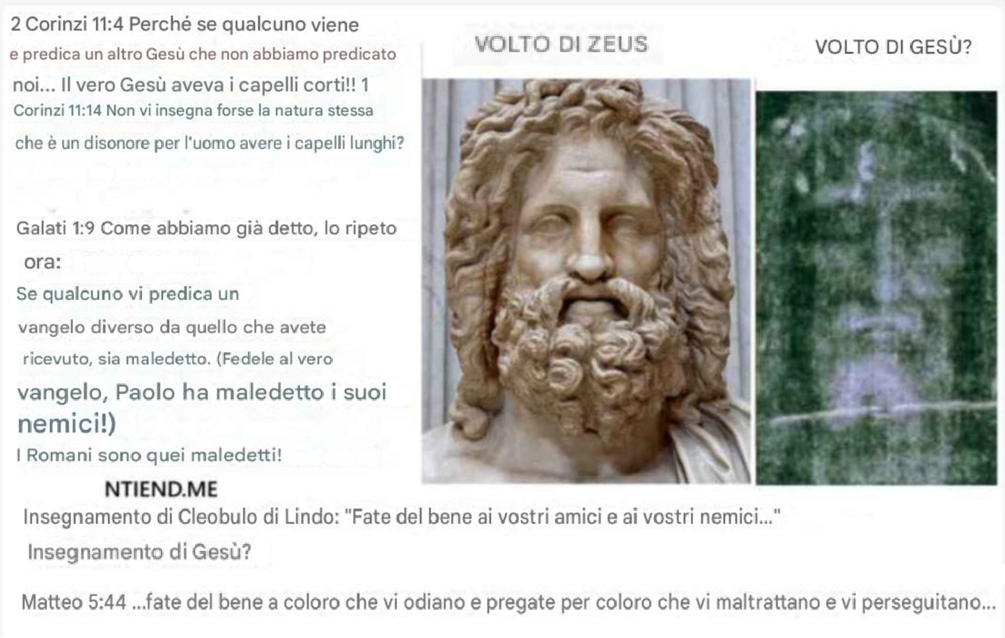 Nell’immagine in basso a destra: Zeus presentato come Gesù, con un cartello in mano, in qualità di difensore dell’accusato: