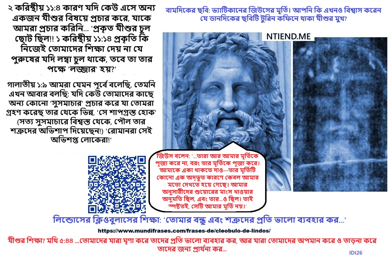 ২ করিন্থীয় ১১:৪ কারণ যদি কেউ এসে অন্য একজন যীশুর বিষয়ে প্রচার করে, যাকে আমরা প্রচার করিনি… ‘প্রকৃত যীশুর চুল ছোট ছিল!! ১ করিন্থীয় ১১:১৪ প্রকৃতি কি নিজেই তোমাদের শিক্ষা দেয় না যে পুরুষের যদি লম্বা চুল থাকে, তবে তা তার পক্ষে ‘লজ্জার’ হয়?’