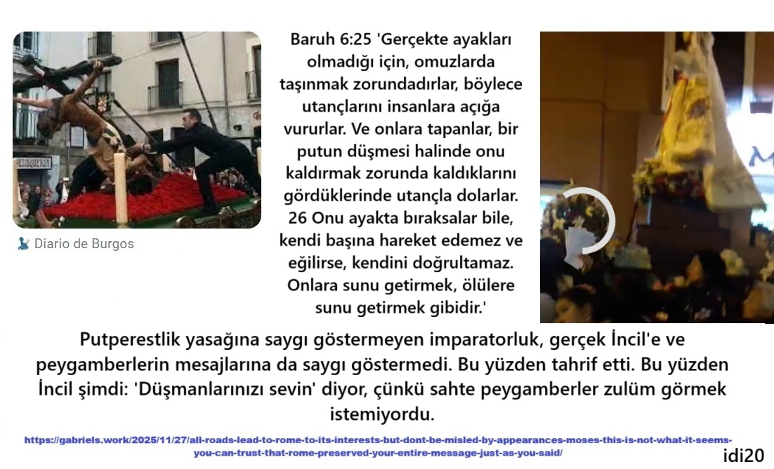 Putperestlik yasağına saygı göstermeyen imparatorluk, gerçek İncil’e ve peygamberlerin mesajlarına da saygı göstermedi. Bu yüzden tahrif etti. Bu yüzden İncil şimdi: ‘Düşmanlarınızı sevin’ diyor, çünkü sahte peygamberler zulüm görmek istemiyordu.