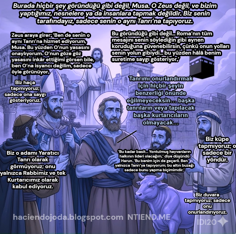 Burada hiçbir şey göründüğü gibi değil, Musa. O Zeus değil, ve bizim yaptığımız, nesnelere ya da insanlara tapmak değildir. Biz senin tarafındayız, sadece senin o aynı Tanrı’na tapıyoruz.