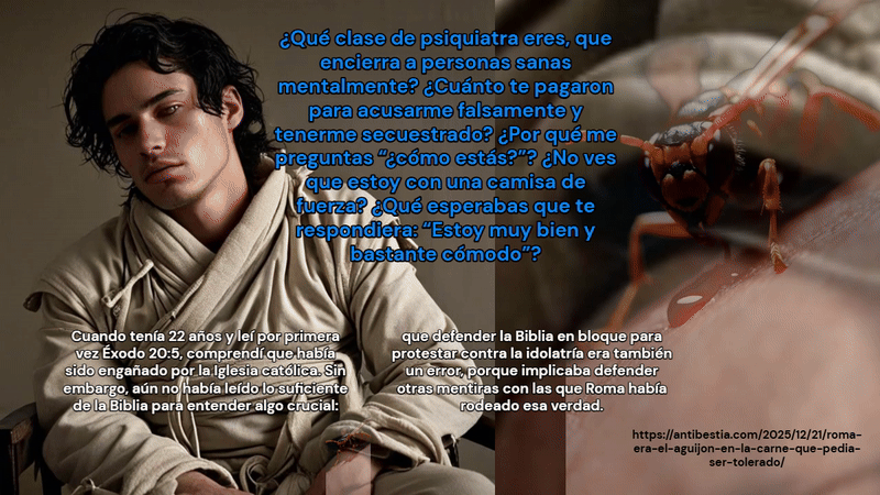 Así como Roma rodeó esa verdad con falsedad, también fui rodeado yo por personas hostiles que eligieron seguir postradas ante los ídolos de Roma en lugar de valorar el mensaje de Éxodo 20:5, obedecerlo y agradecer que se los compartiera como advertencia contra el engaño. En lugar de dialogar, reaccionaron con calumnias y me pusieron en cautividad.