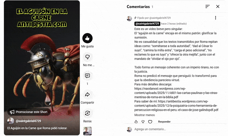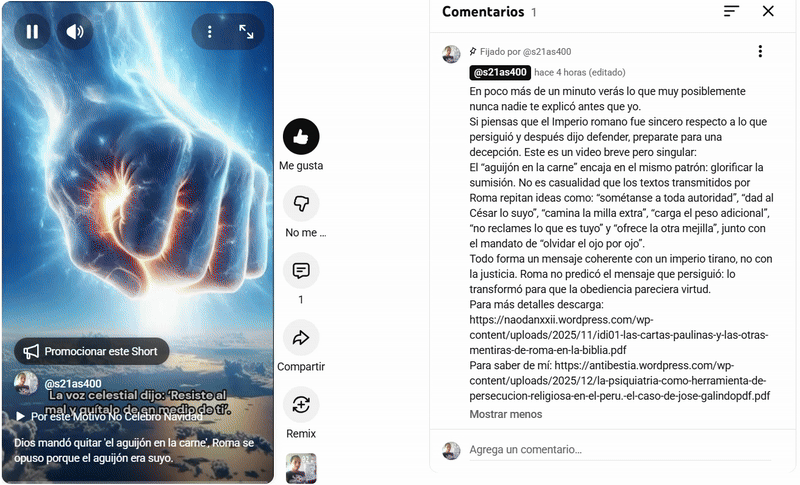 Salmos 112:9 Reparte, da a los pobres; Su justicia permanece para siempre; Su poder será exaltado en gloria. 10 Lo verá el impío y se irritará; Crujirá los dientes, y se consumirá. El deseo de los impíos perecerá.El malvado nunca reconoce que adorar imágenes es un pecado. En cambio, el justo sí lo reconoce, porque su reacción ante la verdad es distinta. Éxodo 20:5 No te inclinarás ante imágenes ni las adorarás. En la otra vida, el justo descubre la verdad y se siente indignado contra los malvados que con falsas enseñanzas le hicieron cometer idolatría. Por eso busca volver al camino de la justicia. Salmos 41:4-5 Dije: ‘Señor, ten misericordia de mí y sana mi alma, porque he pecado contra ti.’ Mis enemigos hablan mal de mí, preguntando: ‘¿Cuándo morirá y será olvidado su nombre?’ Por ese motivo, él está ‘vestido de cilicio’, una expresión que representa su indignación y su dolor por haber caído en la trampa de los engañadores. Él no está buscando arrepentirse, porque ya lo está. Lo que busca es justicia. Apocalipsis 11:3 Daré poder a mis dos testigos para que profeticen durante 1260 días, vestidos de cilicio. Lucas 17:28-30 En los días de Lot, la gente comía, bebía, compraba, vendía, plantaba y construía. Pero el día que Lot salió de Sodoma, llovió fuego y azufre del cielo y los destruyó a todos. Así será cuando el Hijo del Hombre se manifieste. Pero esta penitencia no durará para siempre, sino por 1260 días (un tiempo, tiempos y medio tiempo, donde ‘un tiempo’ equivale a 360 días). Daniel 12:7 Entonces oí al hombre vestido de lino, que estaba sobre las aguas del río. Levantó sus manos al cielo y juró por el que vive para siempre que todo esto terminará después de un tiempo, tiempos y la mitad de un tiempo. Cuando el poder del pueblo santo sea quebrantado, todas estas cosas se cumplirán. https://naodanxxii.wordpress.com/wp-content/uploads/2025/11/idi01-las-cartas-paulinas-y-las-otras-mentiras-de-roma-en-la-biblia.pdf .» «La religión que yo defiendo se llama justicia. █ Yo la encontraré cuando ella me encuentre y me creerá lo que cuento. El Imperio romano ha traicionado a la humanidad inventando religiones para someterla. Todas las religiones institucionalizadas son falsas. Todos los libros sagrados de esas religiones contienen fraudes. Sin embargo, hay mensajes que tienen sentido. Y hay otros, faltantes, que pueden deducirse a partir de los legítimos mensajes de justicia. Daniel 12:1-13 — ‘El príncipe que lucha por la justicia se levantará para recibir la bendición de Dios.’ Proverbios 18:22 — ‘La esposa es la bendición que Dios le da al hombre.’ Levítico 21:14 — ‘Él debe desposar una mujer virgen de su misma fe, porque ella es del mismo pueblo de él, el que será libertado cuando los justos se levanten.’ 📚 ¿Qué es una religión institucionalizada? Una religión institucionalizada es cuando una creencia espiritual se transforma en una estructura de poder formal, diseñada para controlar personas. Deja de ser una búsqueda individual de la verdad o la justicia, y se convierte en un sistema dominado por jerarquías humanas, al servicio del poder político, económico o social. Ya no importa lo que es justo, verdadero o real. Lo único que importa es obedecer. Una religión institucionalizada incluye: Iglesias, sinagogas, mezquitas, templos. Líderes religiosos con poder (curas, pastores, rabinos, imanes, papas, etc.). Textos sagrados ‘oficiales’ manipulados y fraudulentos. Dogmas que no se pueden cuestionar. Reglas impuestas sobre la vida personal de las personas. Ritos y rituales obligatorios para poder ‘pertenecer’. Es la forma en que el Imperio romano, y luego otros imperios, usaron la fe para someter a los pueblos. Convirtieron lo sagrado en negocio. Y la verdad, en herejía. Si todavía crees que obedecer a una religión es lo mismo que tener fe, te mintieron. Si todavía confías en sus libros, confías en los mismos que crucificaron la justicia. No es Dios quien habla en sus templos. Es Roma. Y Roma nunca dejó de hablar. Despierta. El que busca justicia no necesita permiso. Ni institución.
