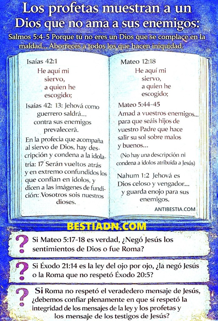 Un hombre se acercó a la bestia y le dijo: ‘No es como dijiste. El malvado pecador eres tú y también quienes falsificaron las palabras de Dios para justificar la doctrina del amor por los enemigos. Eres pecador no por ignorancia, sino por ser injusto. Dios odia a los injustos porque Dios es justo. Los pecadores que Dios ama son los justos, porque no pecan por ser injustos, sino por ignorancia, los justos al defender tu vida eran ignorantes’. Yo solía oponerme a la pena de muerte, incluso a la justificada porque me engañaron los fraudes de Roma, me hicieron creer que ‘No matarás’ era un mandamiento equivalente a ‘No le quitarás la vida a un ser humano bajo ninguna circunstancia’, lo cual busca demonizar a los verdugos justos y dejar sin un castigo justo a los que matan con injusticia, hasta que aprendí la verdad y dejé de cometer ese pecado; Para maldecir a la institución que defendió vidas como la tuya por estar liderada precisamente por personas como tú, y no por personas justas, se ha escrito: Apocalipsis 18:6 Pagadle tal como ella ha pagado, y devolvedle doble según sus obras; en la copa que ella ha preparado, preparad el doble para ella. ¿Dónde ves aquí que no debamos condenarte a muerte por tus crímenes bajo el amparo de un evangelio de amor inmerecido?, lo que se revela es la verdad. la verdad que ocultó Roma. Lo que no es merecido no es justo, y si algo no es justo, eso es algo que Dios no aprueba, por lo tanto, Dios no aprueba esta calumnia de Roma en la Biblia: Efesios 3:7-9 ‘Por su amor inmerecido, Dios me dio el privilegio de servirle anunciando estas buenas nuevas, con la ayuda eficaz de su poder’. Dios aprueba esta verdad que Roma no ocultó, pues quiso usar algunas verdades a modo de camuflaje, pero ese fue el error de ‘Babilonia’, pretender ser una santa cuando es una ramera: Apocalipsis 16:5 Y oí al ángel de las aguas, que decía: Justo eres tú, oh Señor, el que eres y que eras, el Santo, porque has juzgado estas cosas. 6 Por cuanto derramaron la sangre de los santos y de los profetas, también tú les has dado a beber sangre; pues lo merecen. 7 También oí a otro, que desde el altar decía: Ciertamente, Señor Dios Todopoderoso, tus juicios son verdaderos y justos.
