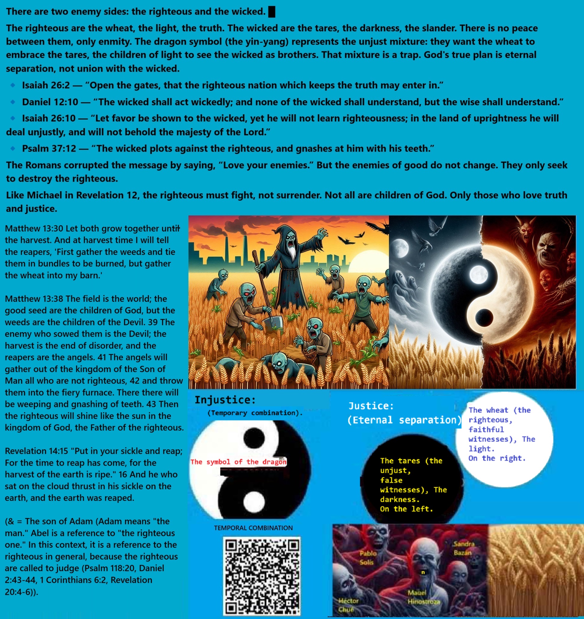 Por esta verdad defiendo la pena de muerte: Daniel 12:10. Por eso Roma inventó mentiras para la Biblia, porque nunca se convirtió a la religión de la justicia, sino que la adulteró. Como los injustos no cambian, Roma no solo continuó con los ídolos, sino que también predicó injusticias como el amor y el perdón inmerecidos (impunidad), mediante un falso evangelio que predica amor a los extorsionadores (los enemigos de las buenas personas) en Mateo 5:44. Daniel 12:10 dice: «Muchos serán purificados, emblanquecidos y purificados. Los malvados cometerán iniquidad, y ninguno de los malvados entenderá, pero los sabios entenderán (los que no son malvados entenderán: los justos entenderán)».